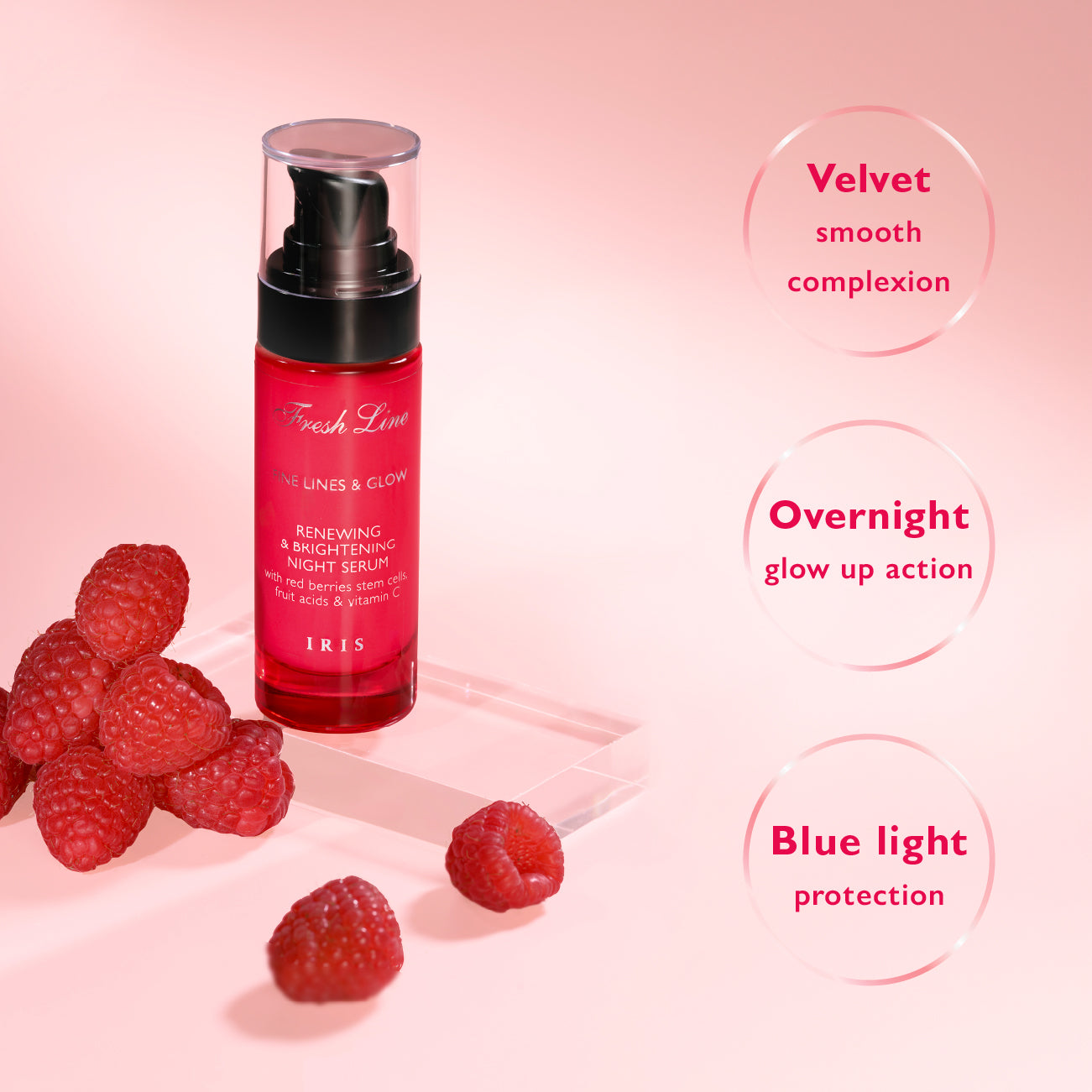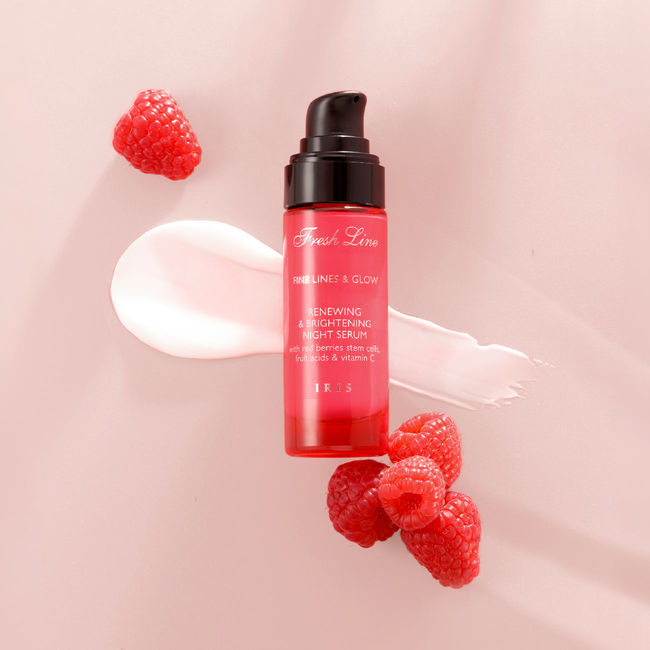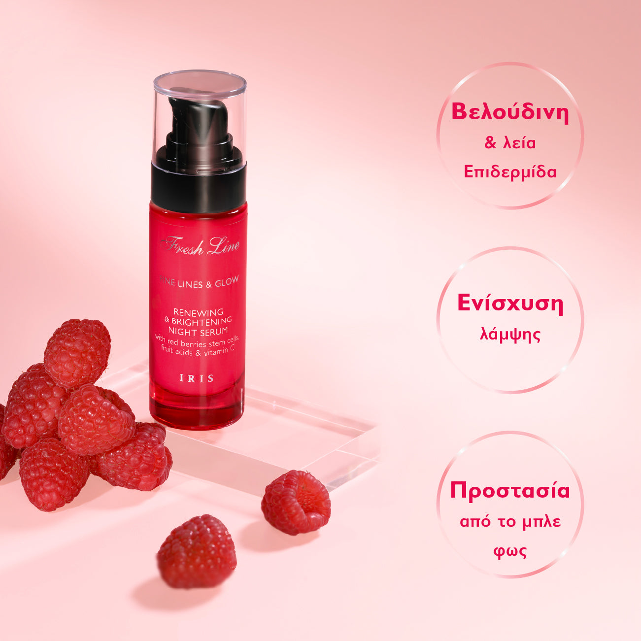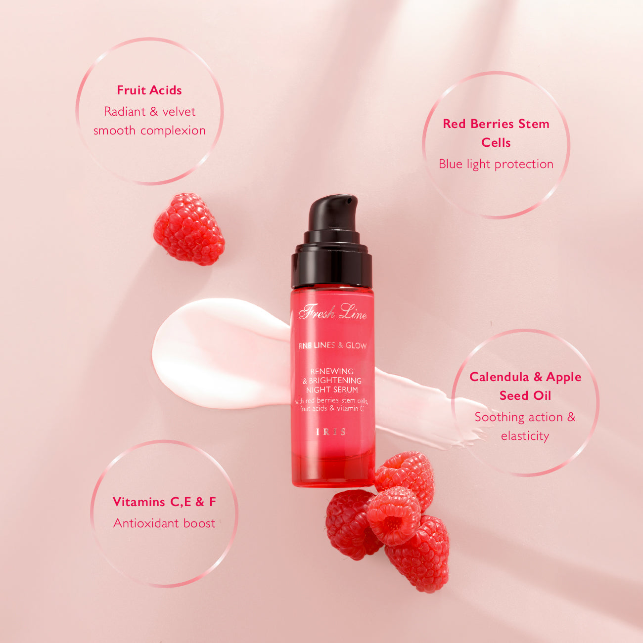 Αναζωογόνησε την επιδερμίδα σου κατά τη διάρκεια της νύχτας με τον ορό Ίρις! Ένα πλούσιο κοκτέιλ με βλαστοκύτταρα κόκκινου μύρτιλου, οξέα φρούτων και βιταμίνη C που ενεργοποιεί την κυτταρική ανανέωση και αποκαλύπτει μια πιο λαμπερή, λεία και απαλή επιδερμίδα το πρωί.